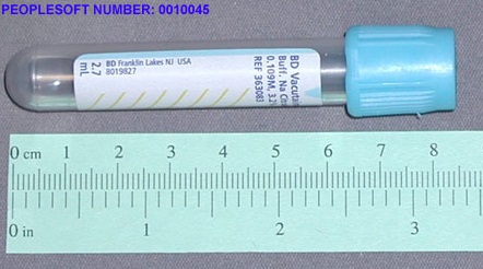 Blue top tubes must be filled within 10% of stated volume. A discard tube must be used if a citrate tube is to be drawn using a winged blood collection set. It is important to remove air from the blood collection set to ensure the proper blood volume is obtained in the coag tube.