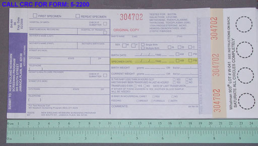 Specimens should be collected between 24-72 hours after birth. 4 well soaked spots on filter paper supplied by the NH Newborn Screening Program. Contact Lab at 5-2200 for Newborn Screen filter paper supplies.